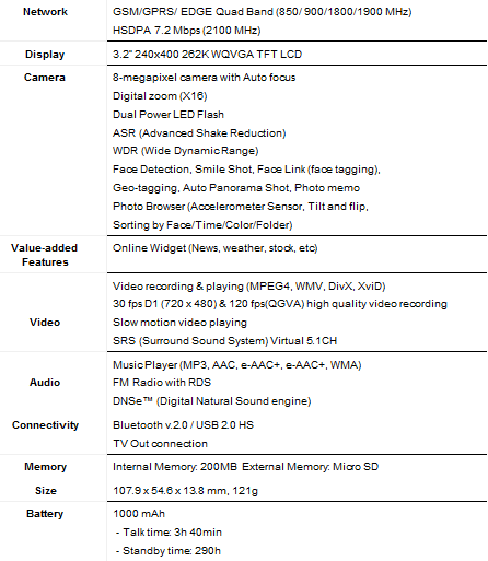 Running the latest version of Samsung's TouchWiz OS (though not Windows Mobile, as with the Omnia), the Pixon has a new photo browser with accelerometer-controlled screen rotation. There's also a media player, FM radio with RDS, video capture of up to 30 fps D1 (720 x 480) or 120 fps QGVA, Bluetooth 2.0 and USB 2.0. Internal storage is 200MB and can be expanded with microSD cards.