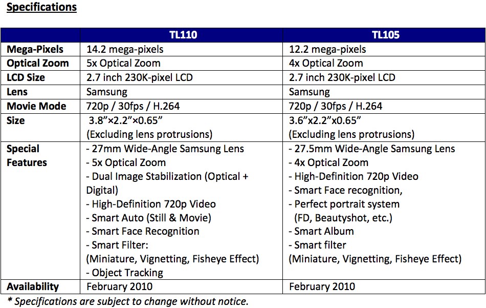 "Consumers want portability in a point and shoot, and we think our ultra-slim TL110 and TL105 address that desire," said Mr. SJ Park, CEO of Samsung Digital Imaging Company. "Despite their size, both the TL110 and TL105 are feature-packed and ideal for beginner and advanced photographers who want a well-equipped but easy to use, compact camera."