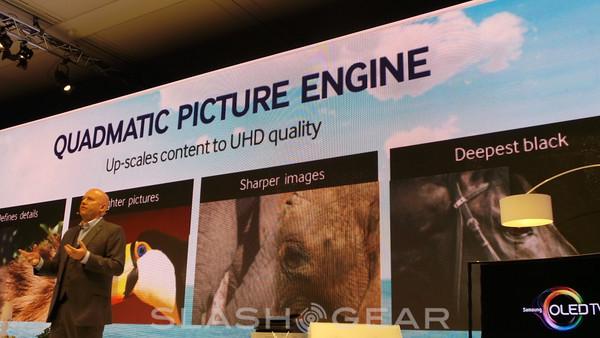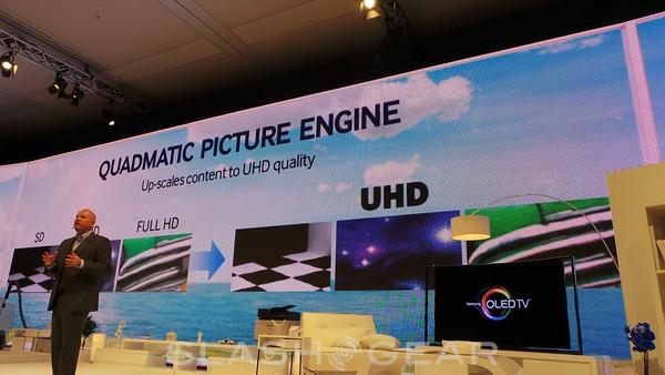 What that means is despite the fact that there is very little to choose from in 4K from Hollywood or major television networks in UHD resolution right now, the TV can upscale anything from any source connect to it. Samsung says whether the content you're watching originally aired in standard definition, HD, or full HD resolution the Quadmatic Picture Engine is able to take that source image, eliminate visual noise, improve detail and sharpness, and turn it into UHD resolution.