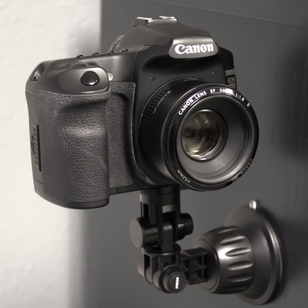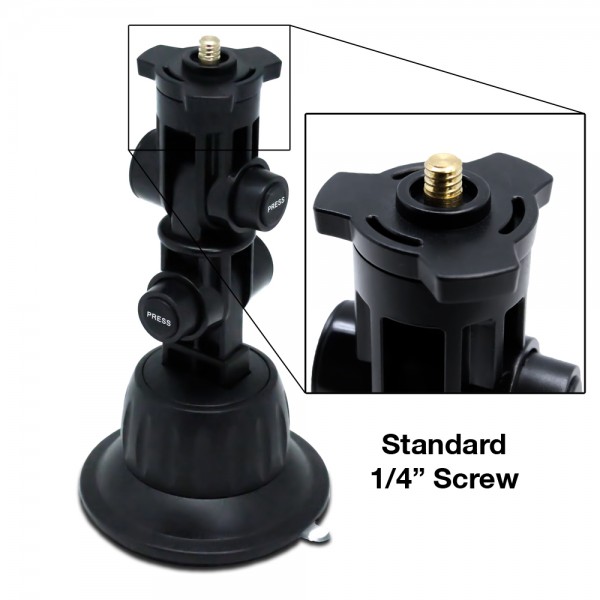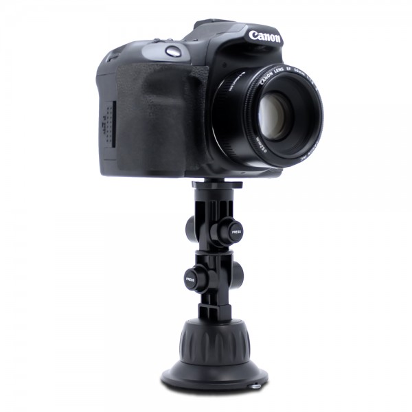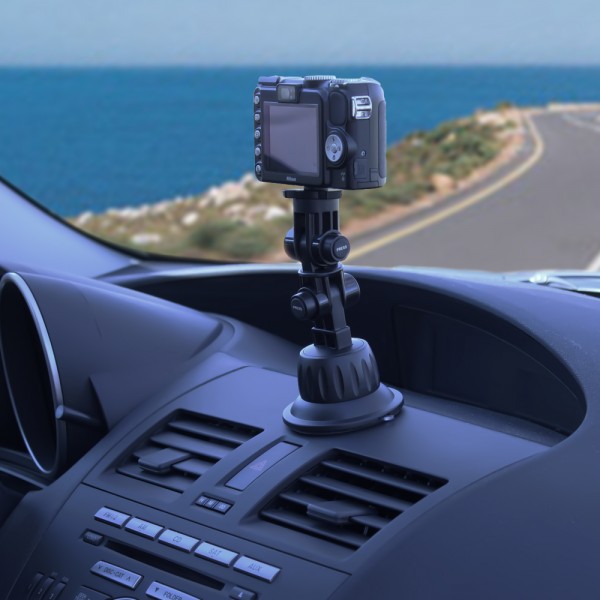 This little beast is able to work with any kind of camera with a 1/4-inch screw hold under it, this including your DSLR cameras, point-and-shoot models, and more! Once you've got the device attached to the stand, you've only to stick the pad to your dash (or wall, or whatever you've got that you want to stick it to,) and plop the stand on top with its suction cup action. The entire stand then holds your camera either straight up and down or in a variety of positions.