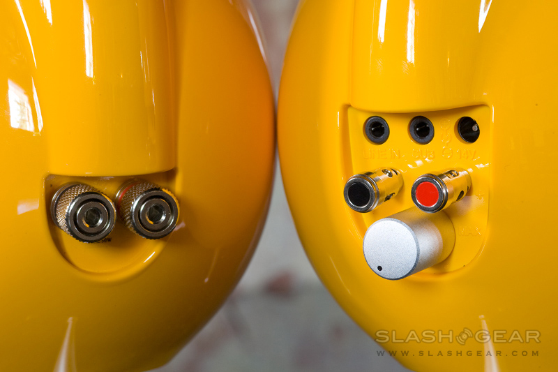 Being an active-speaker, the right speaker includes an integrated 10 watt amplifier. The back of the speaker sports an auxiliary-input audio jack, subwoofer output with a volume/power knob and terminals for the audio cable to the left speaker. There's a pair of five-way speaker terminal mounts on the right speaker with an unusual push spring locking type on the other. Unlike most speakers, the unit stands on three detachable aluminum spiked feet. The feet are easy to remove and secure with little effort. Overall design is very well thought with excellent build quality for $299.