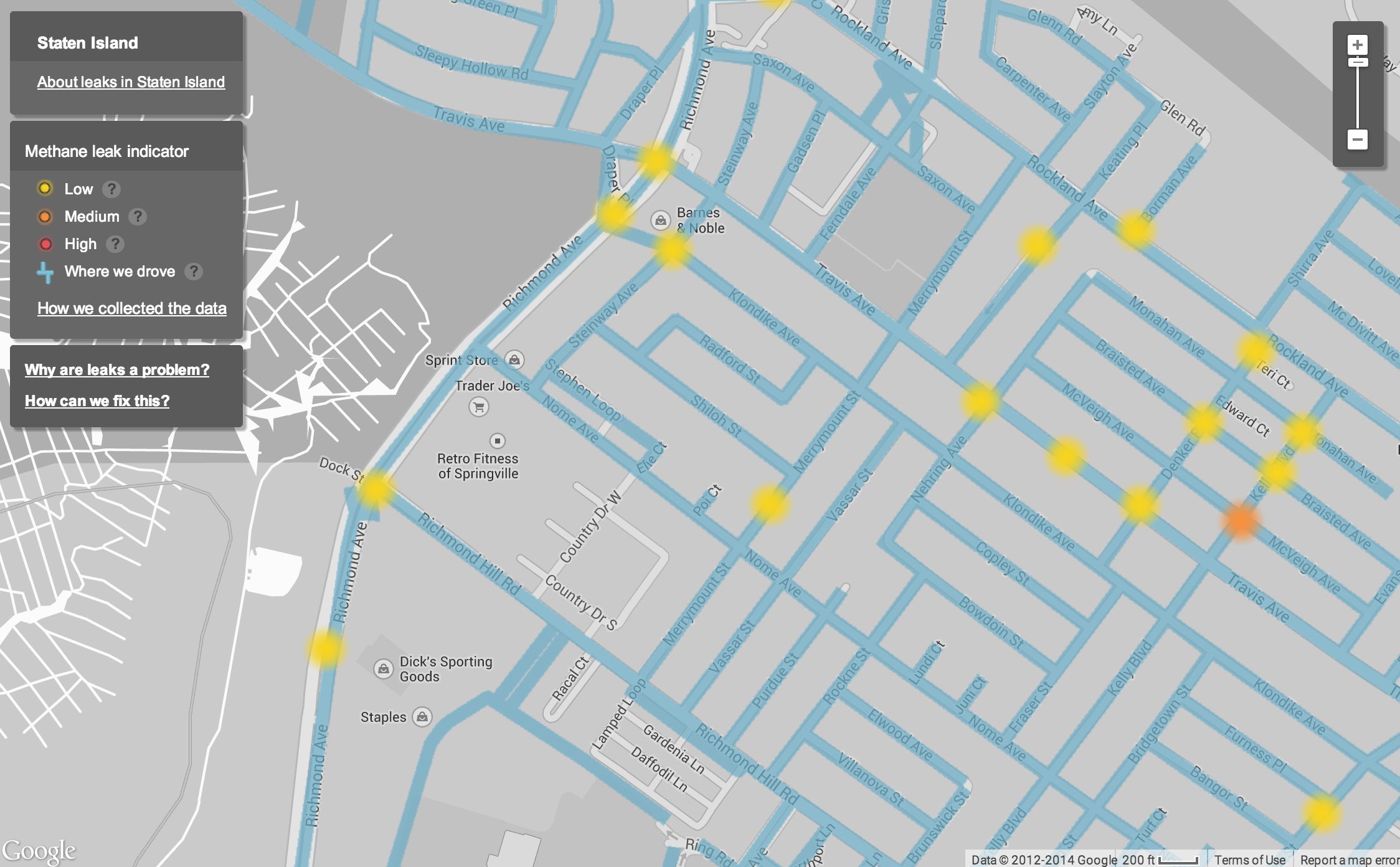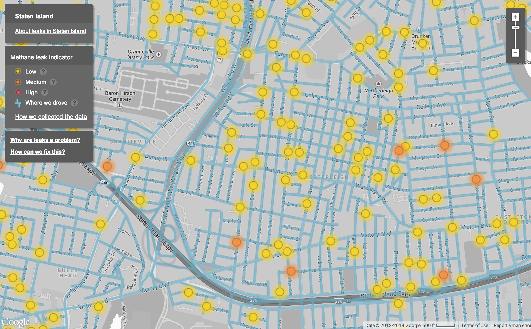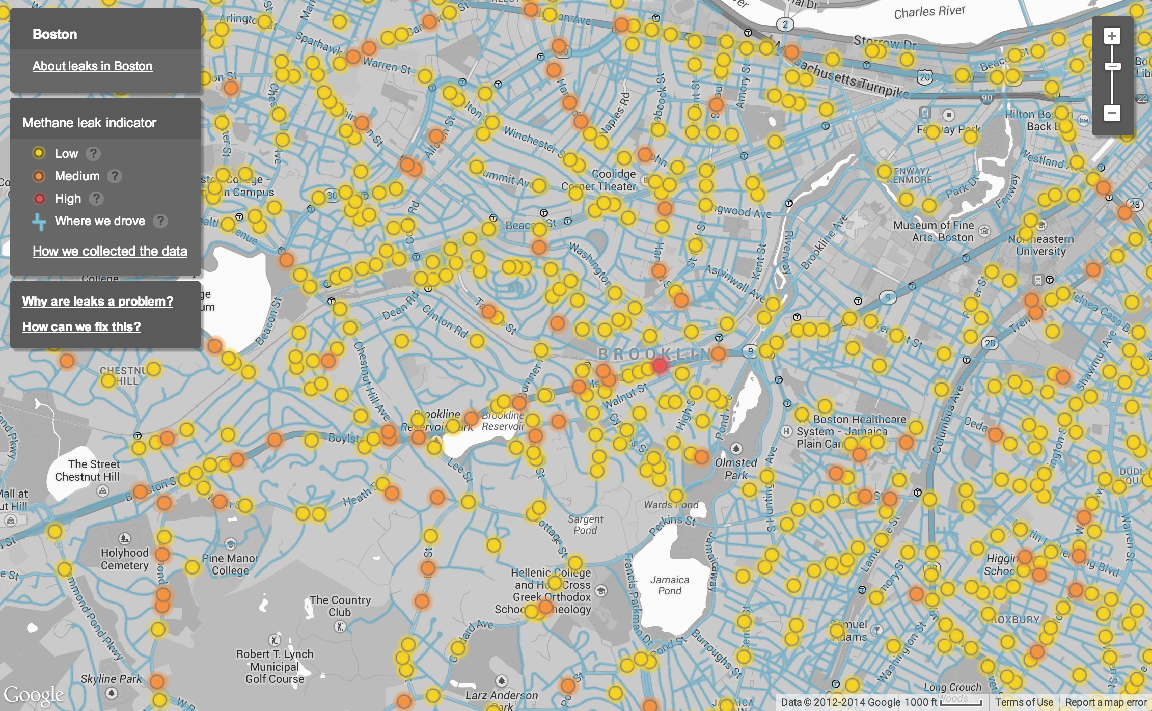 Natural gas leaks have been mapped by Google's Google Maps Street View cars as they've rolled through cities over the past year. This project is a collaboration between the EDF – Environmental Defense Fund, Google, Colorado State University, and a number of utility companies. Google provided the Street View vehicles mounted with air-quality sensors, tying this information collected to Google Maps.