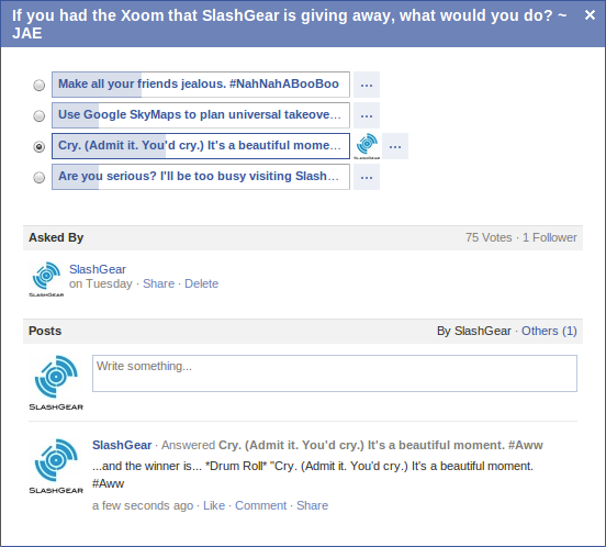 Let me let you know what's going on here. We've got these XOOM tablets, five of them – 2 for SlashGear and 3 for Android Community, and we're gonna give them away for free. They're all Wifi-only so you don't have to worry about paying a monthly fee, in fact you don't have to worry about paying for anything, because they're totally, totally free. We've been getting some pretty awesome entries for this contest since it started, and in showing a few classics to you now, we'd like you, the people who haven't joined in the fun yet, to enter!