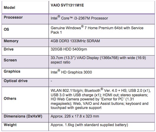 There's also Bluetooth 4.0+HS and WiFi b/g/n, though Sony hasn't said whether it will be offering a WWAN option with integrated 3G/4G. Processors are plucked from Intel's 2nd Gen Sandy Bridge range, kicking off with the Core i3-2367M with Intel HD 3000 graphics; they're paired with 4GB of RAM and either HDD, HDD/SSD hybrid, or full SSD storage.