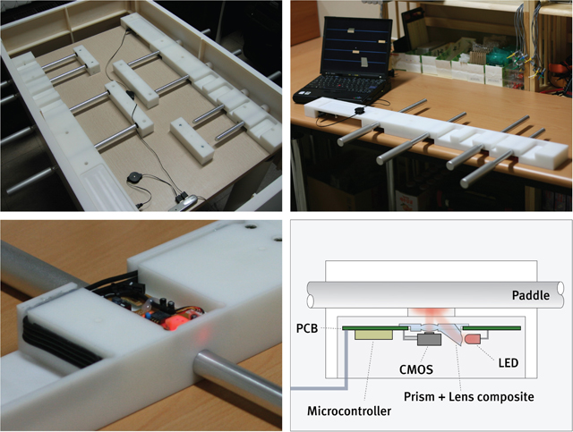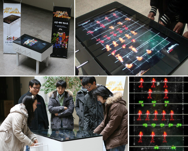 Take one of the most iconic arcade games, mix it up with a classic real-world game, and you might be so lucky as to end up with Space Foosball. The DIY handiwork of Young J. Kim's team at the Korean Ewha Women's University Computer Graphics Lab, Space Foosball uses the familiar handle controls from a foosball table but encodes their movement digitally, with the university's own Everyware physics engine used to power gameplay.Video demo after the cut
