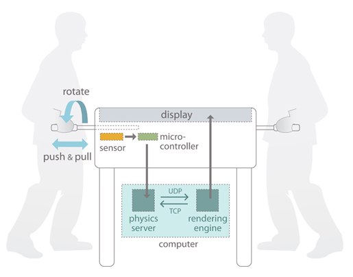 The movement of the handles is tracked via infra-red sensors, and then passed to a PC in the base of the table. That controls a horizontal display on which the rows of men are drawn together with the physics of the ball mapped out.