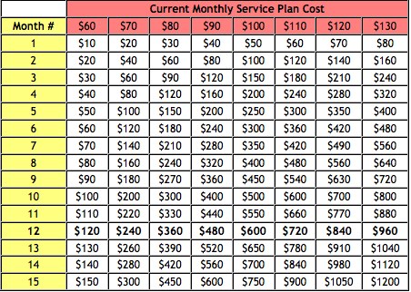 Even though the prices for wireless contract options have stayed about the same, the prepaid market pricing has been steadily declining. Boost Mobile plans to market this new price point very heavily and even reach out to those who currently have contract agreements. The $50 package includes unlimited, voice, text and wireless Internet access. Most contractual agreements do not offer text and Internet in the unlimited pricing, only minutes. Below are charts outlining the monthly expenses and running totals for each plan price.