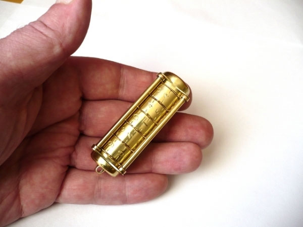 This is a flash drive and it's inside a tube that requires a combination to open. That is some cool physical security and the locking style reminds me of a bike lock. The designer used CAD software to design the works and then actually built the parts. It appears to be made out of brass or some other material that looks like brass.