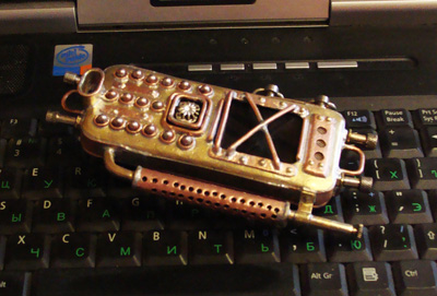 We've had a few Steampunk items come up on here before, and we'd be lying if we said that we didn't hold a natural affinity for these things. How can you not? The workmanship alone makes these gadgets pretty amazing, and whil the aesthetics might not be for everybody, we find it hard to deny the sort of primordial attractiveness these devices have. Like this cell phone for example, which was caught on picture from Russia, and encompasses everything Steampunk in one solid form factor. We've got plenty of shots after the break.