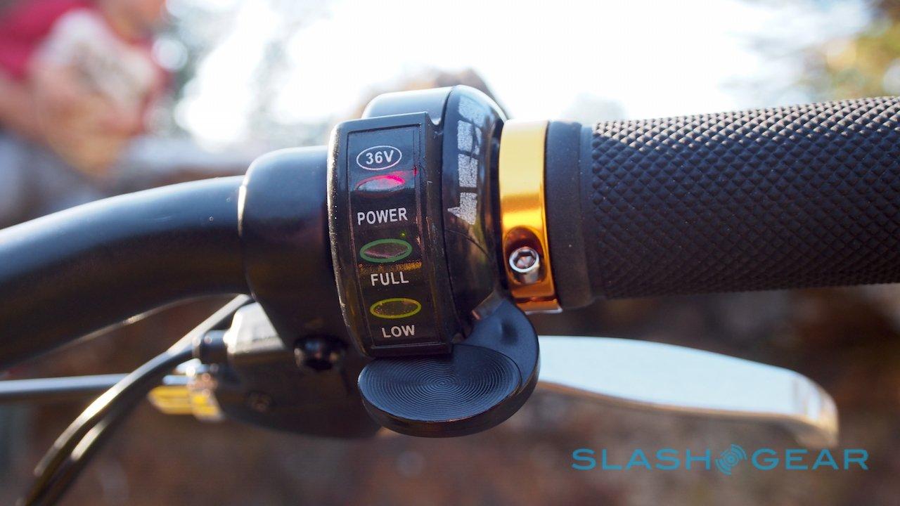 It's a relatively low-frills system, for the most part. You don't get regenerative braking – where the motor turns into a generator while you're slowing, charging up the battery on the fly – and the only control is a spring-loaded lever on the right handlebar. Press it down, and the motor kicks in. Three LEDs show power status, and there's no companion smartphone app with fancy location tracking.