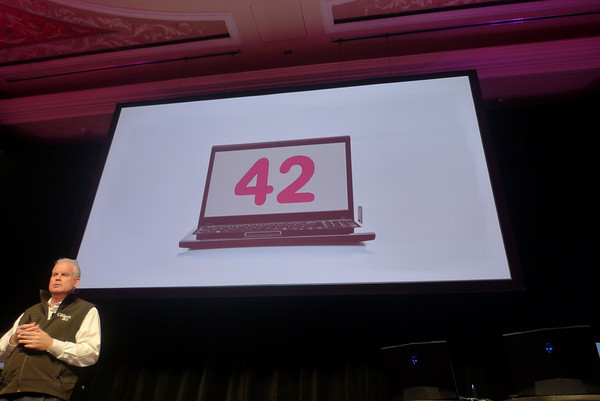 And finally, T-Mobile took some time on stage to show off HSPA+ with 42Mbps right on stage. They began with a streaming test, with a prototype USB stick running the faster network speeds. During the test, there were stable speeds of anywhere between 26Mbps, all the way up to 35Mbps, for download. When they tested upload, it ranged from 2Mbps to 5Mbps, which also seemed stable.