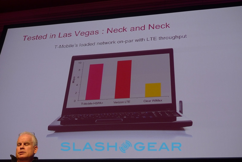 T-Mobile announced that they will be moving to 42Mbps with HSPA+ in the United States. The carrier has been testing HSPA+ in Las Vegas while they've been here, over the last couple of weeks, comparing Verizon's 4G LTE network and Sprint's WiMAX on data sticks, against T-Mobile's HSPA+ network. The results show that Verizon's LTE and T-Mobile's HSPA+ network are neck and neck, while Sprint's WiMAX seems to be trying to keep up. T-Mobile tried to stress that their network was stressed, while Verizon's wasn't.