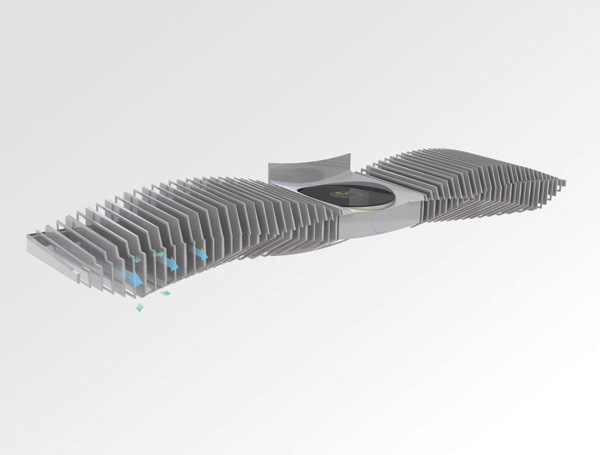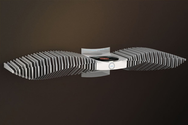 Behold a concept for Vinyl Record playing that should have been brought to the real world years ago. This is the kind of tool that destroys digital music with a single blow. It's a giant of a device with a teeny tiny knob that pulls out to be a wireless remote. It's the greatest invention since the vinyl record itself! Inside you'll find flat membrane speaker technology, each of these speakers (or "fins") acting as the structure of the device as well, making it essentially look like a giant bird.
