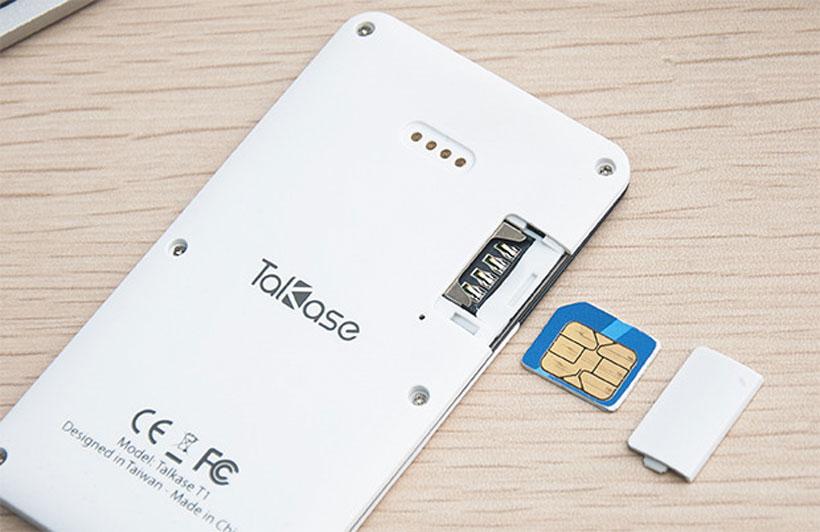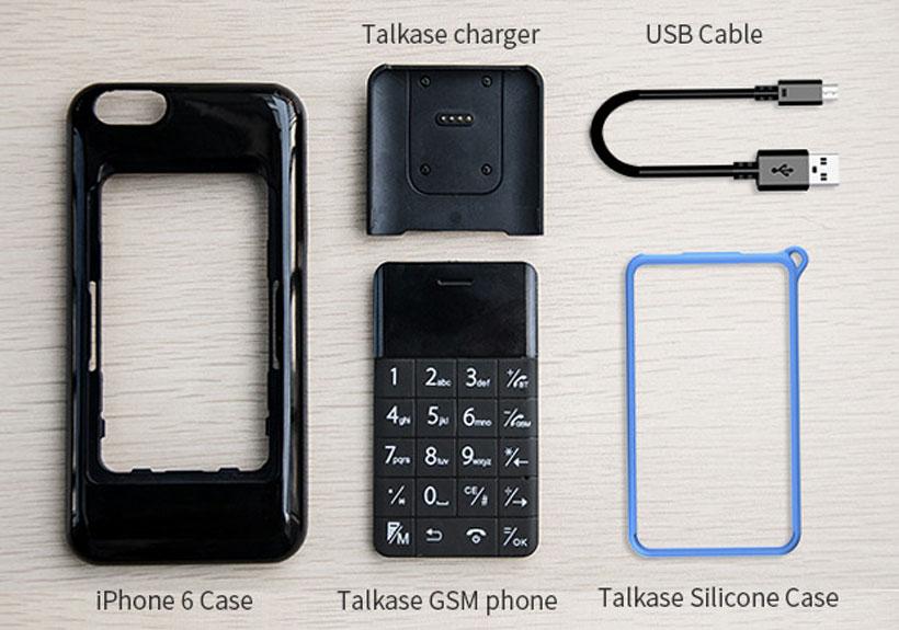 The Talkase mobile phone is a very small and thin device about the size of a credit card. The phone clicks into a plastic case that is available for the iPhone 5S, iPhone 6, and iPhone 6 Plus. The Talkase phone itself is a GSM device that charges via USB.