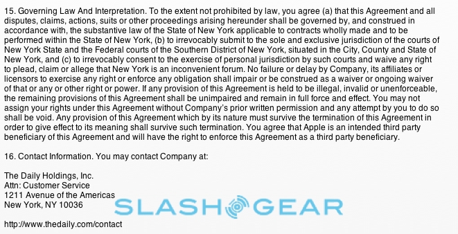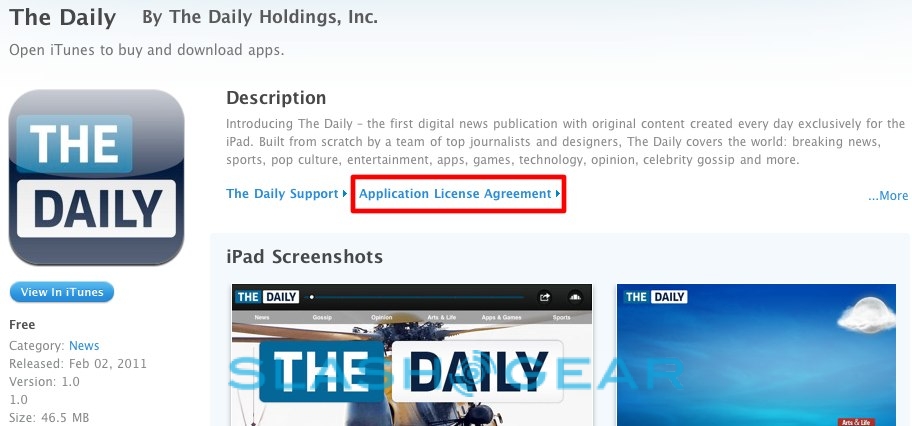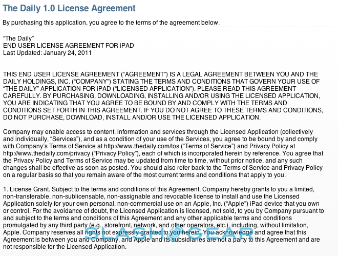 In a new move, iPad digital newspaper The Daily has its own Application License Agreement in the App Store [iTunes link], with a new section on subscriptions. Further in, there's also confirmation that Apple "may ask for your permission to provide the name, email address and ZIP code listed in your Account to the Licensor."