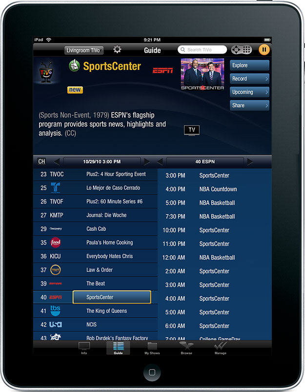 With the TiVo app for iPad, you can search, browse, explore and share your favorite entertainment all without interrupting whatever is playing on your TV.