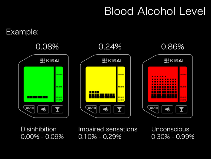 The display is always-on, with a multicolored backlight triggered by the touch-sensitive lamp button. Those colors – and an on-screen chart – would be used to show just how drunk you are and whether you're safe to drive, operate heavy machinery or text old girlfriends.