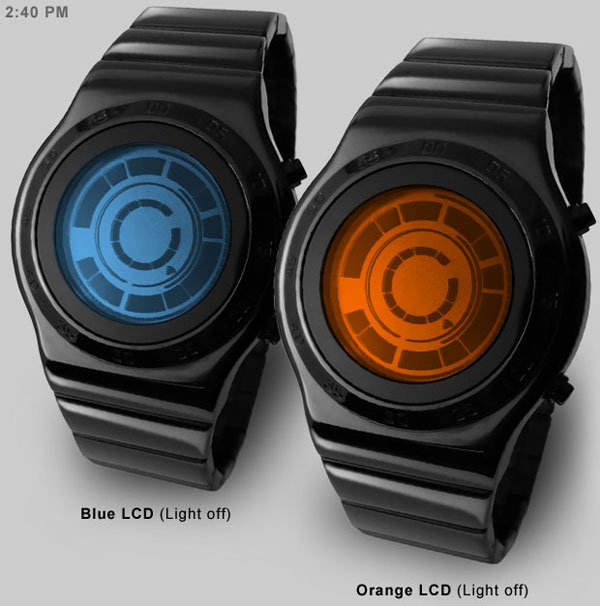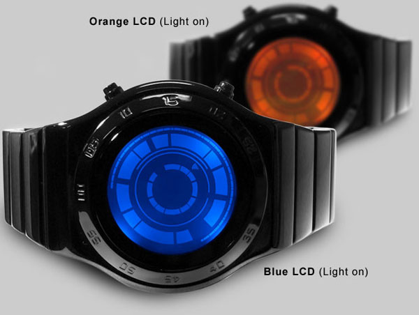 Tokyoflash says that the watch is slim and has a curved design with a solid stainless steel strap. The inner ring of lights shows the hour by removing the bar at the number position for the hour. The larger ring of blocks in the outside is the approximate minutes with the missing block showing the five-minute increment.