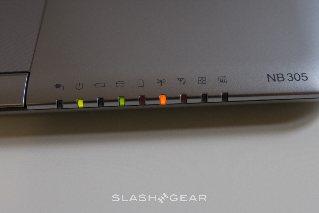 Our review unit, the NB305-N410B, comes with Intel's 1.66GHz Atom N450 processor, 1GB of RAM and a 250GB 5,400rpm hard-drive. The 10.1-inch 1024 x 600 display uses GMA 3150 graphics, and there's WiFi b/g/n, 10/100 ethernet, a webcam, three USB 2.0 ports (one of which remains powered when the netbook is turned off, for charging phones and PMPs) and a multitouch trackpad. The whole thing measures a reasonably compact 10.47 x 7.57 x 1.43 inches, weights 2.60lbs and has a textured Royal Blue finish.