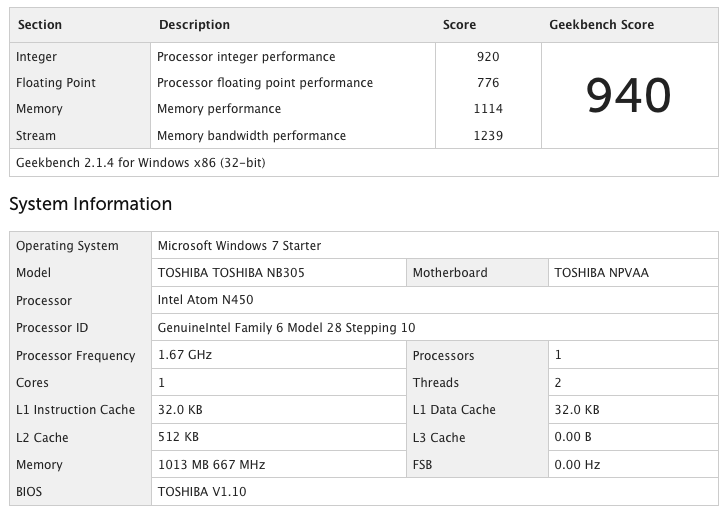 As for more general performance, we benchmarked the NB305-N410B with GeekBench, a synthetic test of processor and memory. The Toshiba scored 940 overall, with lower processor scores pulled up by stronger memory performance. It's only a little stronger than a last-gen Intel Atom N270 processor, however; an ASUS Eee PC 1000H we benchmarked over a year ago, for instance, delivered 883 (albeit running Windows XP versus the NB305's Windows 7 Starter). In real-world use, the Toshiba's capabilities were sufficient for some basic multitasking – emailing and listening to music while surfing the net, for instance – but we still wouldn't recommend a netbook, even a newer Pine Trail model, for anything more ambitious.