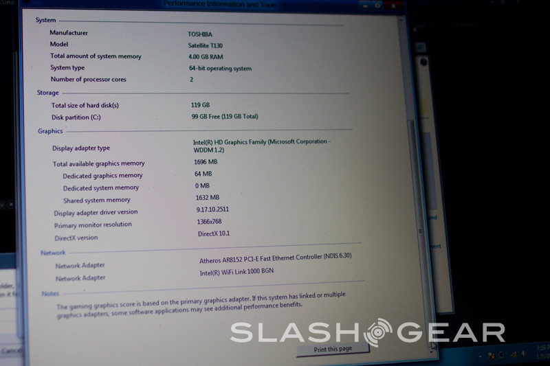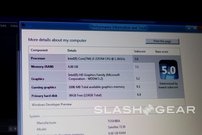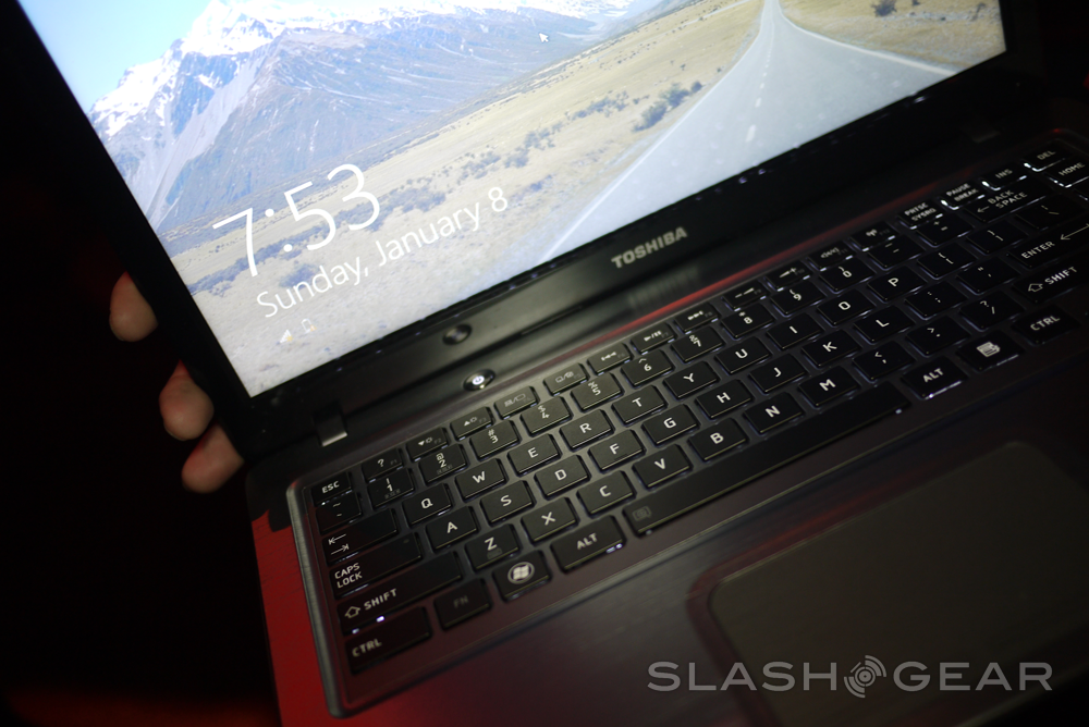 After a little fumbling, we managed to find our way into the "old" Windows 7 desktop and locate the specs of the Toshiba machine. The laptop runs on a mere 1.3Ghz Corei3 processor and 4GB of RAM. Toshiba's graced it with a 128GB SSD drive. The Windows 8 interface runs on integrated graphics, though we couldn't determine what kind. This is extremely early hardware, so things may be a little sketchy as far as the OS reporting goes.