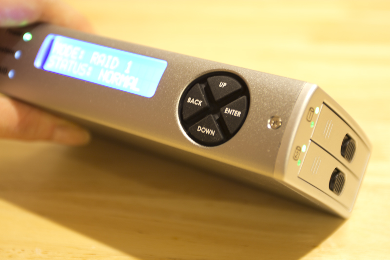 The compact aluminum chassis measures only 6.3-inches by 3.5-inches by 1.3-inches and weighs roughly 1.75lbs. It's built tough to withstand vibration and shock and also uses a passive thermal design for optimal heat dissipation without an internal fan. The large LCD display on the side of the device offers temperature status, monitors drive health, and allows you to configure RAID mode. On one side of the LCD is a black rubberized circular navigation control with four buttons, while the other side has three LED indicators for Power, System, and RAID.