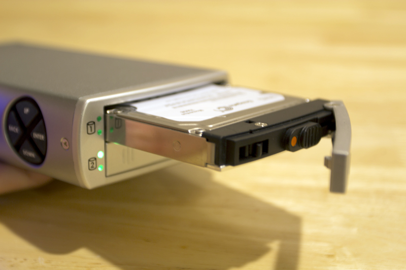 The ToughTech Duo QR model that we got to test sports dual 750GB hard drives for a total capacity of 1.5TB if configured as RAID 0. The hard drives are speedy at 7200RPM and compact at 2.5-inches in size. They are also easily swappable from the front-loading trays without the need for screws, although the drives can be screwed down to the trays for environments where extra stability is required. To remove a tray, you simply slide the black latch to unlock, which will reveal a red circle, and then you press in on the lid of the tray to pop it out.