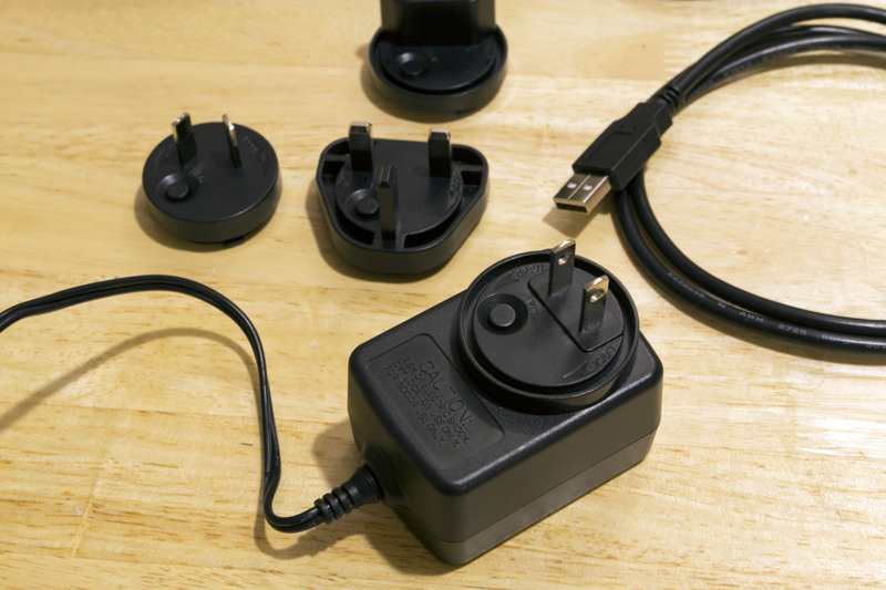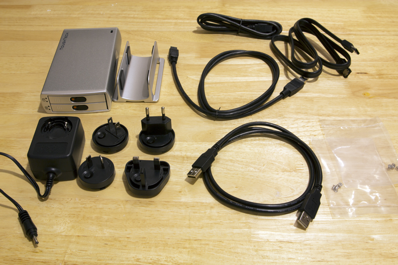 The device pretty much comes with all the cables and power adapters that you'll need. Included in the box are two FireWire 800 cables, one USB 2.0 cable, one eSATA cable, and an AC adapter with swappable prongs for outlet compatibility all around the world, accepting 100-240VAC. There's also an aluminum stand with rubberized grips that you can use to hold the ToughTech Duo in an upright orientation. The device can also just lie flat on its side, if you opt not to use the stand.
