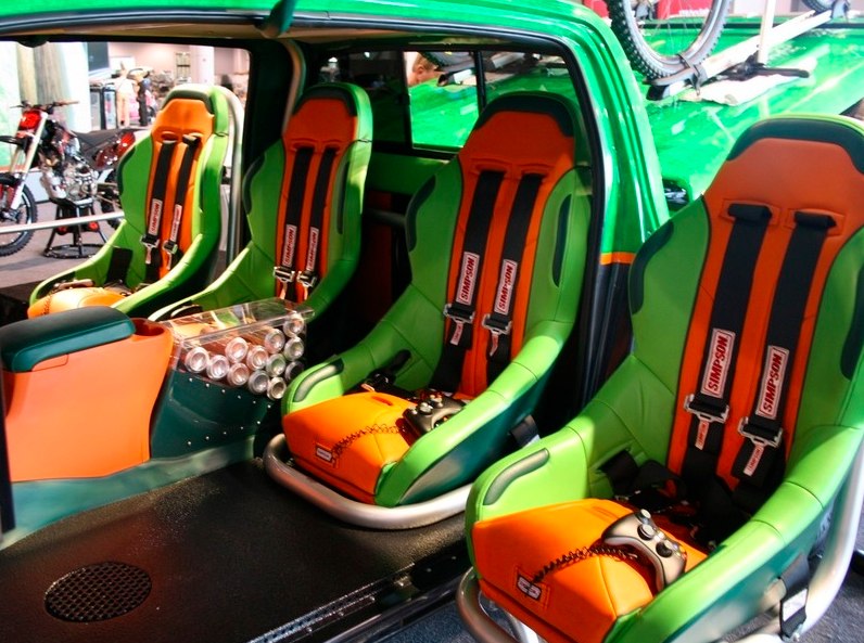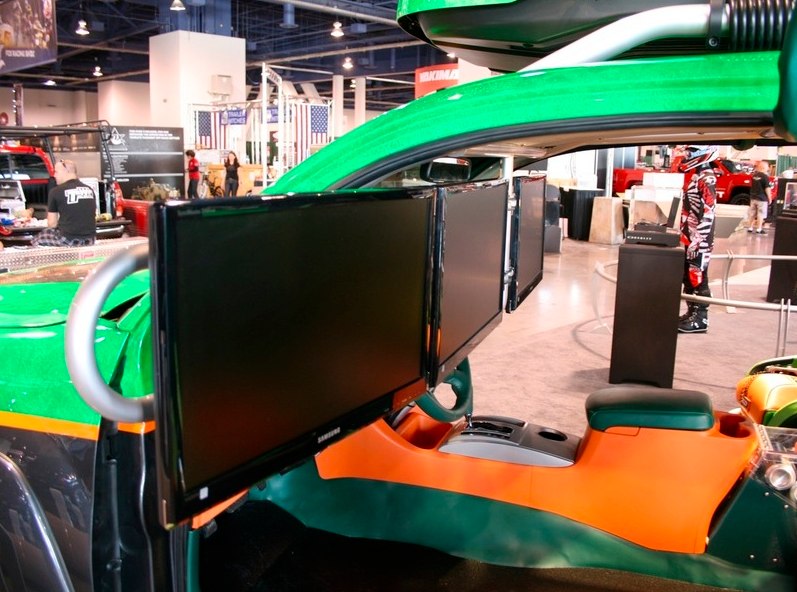 The Tacoma is designed to allow four gamers to play Halo alongside each other, and since squinting at 7-inch headrest-mounted displays lacks the essential gravitas, instead the driver and front-passenger seats motor out and back, to line up with the rear seats. That leaves room for four 24-inch Samsung LCD displays, which swing out in front of them, while still making space for an energy-drink container in-between.