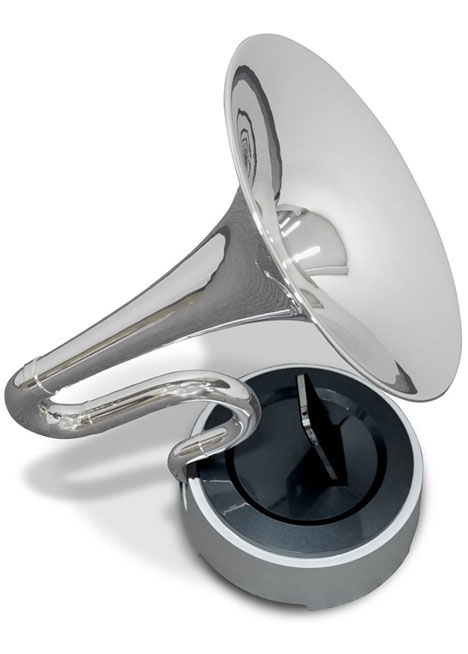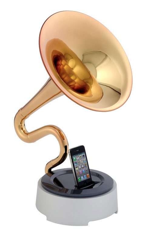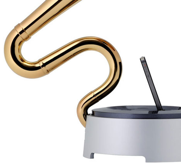 You slip your iPhone into the dock holder, and that s-curve tube picks up the music from the speaker on the bottom of your smartphone and shoots it through the bends until it comes out of the horn opening like an old crank record player. There are two versions of the Trumstand with one offering gold plating and the other in sterling silver.