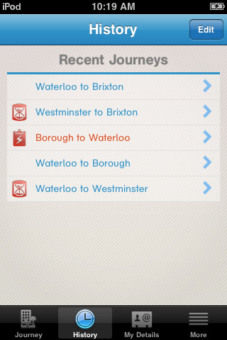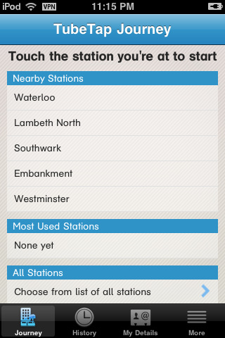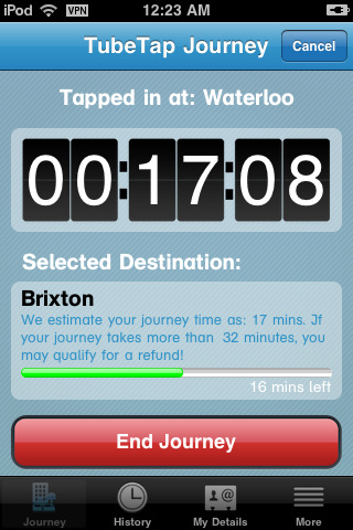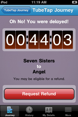 All the user need do is tap a button to say they've entered the station, and then choose their destination stop. TubeTap offers up a list of nearby possibilities, and then the time starts. The "normal" journey time is calculated and – when you tap out at the end – the difference between that and its actual duration is crunched. If you're eligible for a refund then the app uses its store of your personal details to pre-populate the form; a single button press files it.