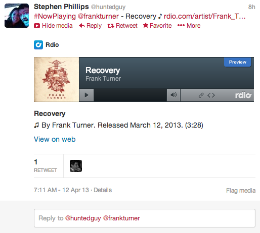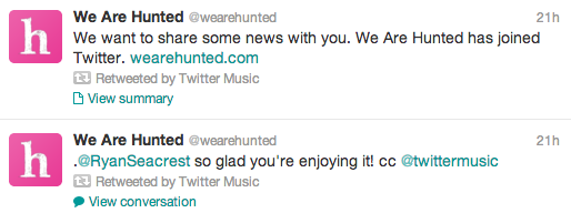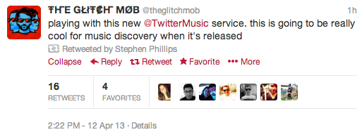 In the gallery above you'll see several music celebrities or otherwise famous people tweeting about what they're still calling "Twitter Music". You'll also find Stephen Philips – part of We Are Hunted – tweeting a few bits of music playable through Twitter itself. While this isn't unheard of in the past, we must assume that Twitter will integrate such abilities in the near future for use by anyone working with Twitter only – or perhaps a Rdio account will be required. We shall see!