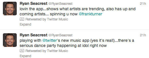 The Twitter music service we're seeing here has been given a bit of a viral push by the likes of Ryan Seacrest earlier this week out in the open in a rather obvious bid for some pre-release chatter. You'll find Zynga to have used this same fellow for some Draw Something 2 stoking as well, just under a month ago – the time is nigh!