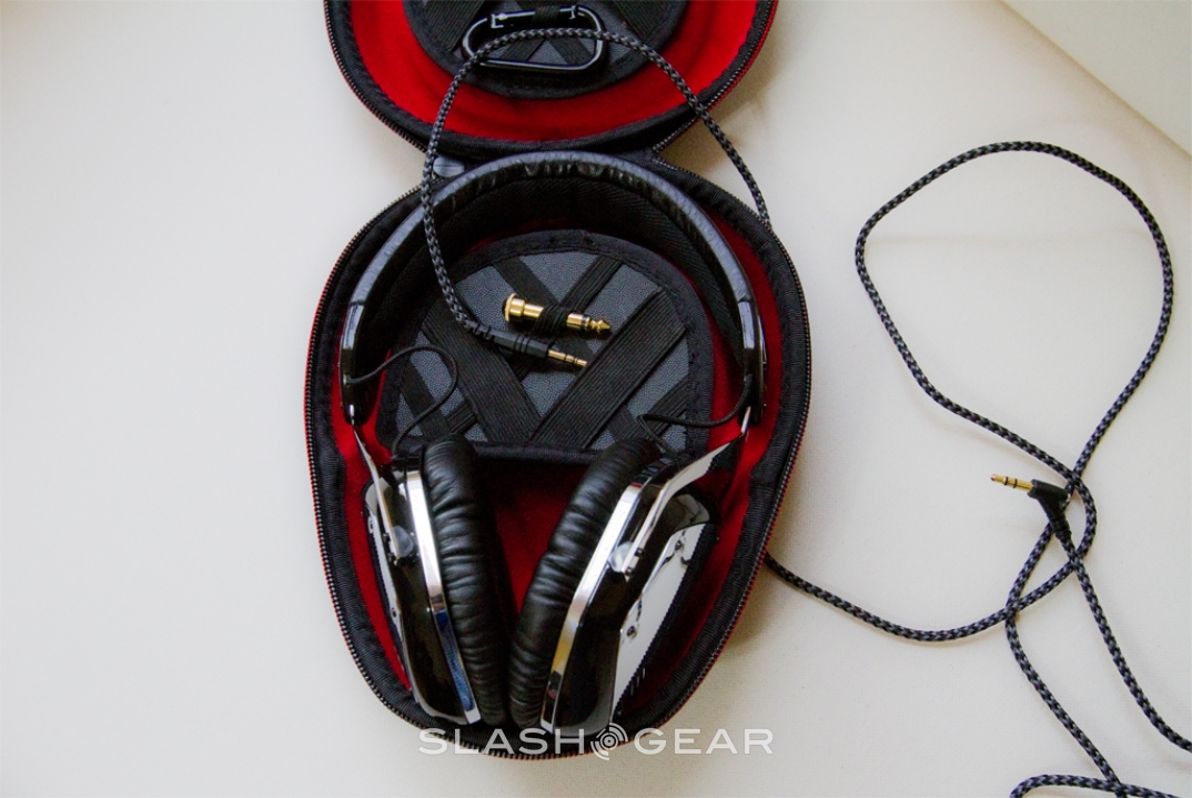 Inside the box there's a hard-shell carrying case moulded to the shape of the headphones themselves. Unzip it and you'll find the accessories, neatly tucked into elasticated pouches and straps. Notable are the two audio cables V-MODA provide, one for basic stereo audio and another with in-line controls for your cellphone and a microphone for hands-free calls. Each is fabric-braided, making them tricky to get tangled, with gold-plated plugs (one straight, the other at a 45-degree angle); V-MODA also bundle a 1/4-inch adapter for audio sources with larger sockets. Finally there's a carabiner clip and a cleaning cloth.