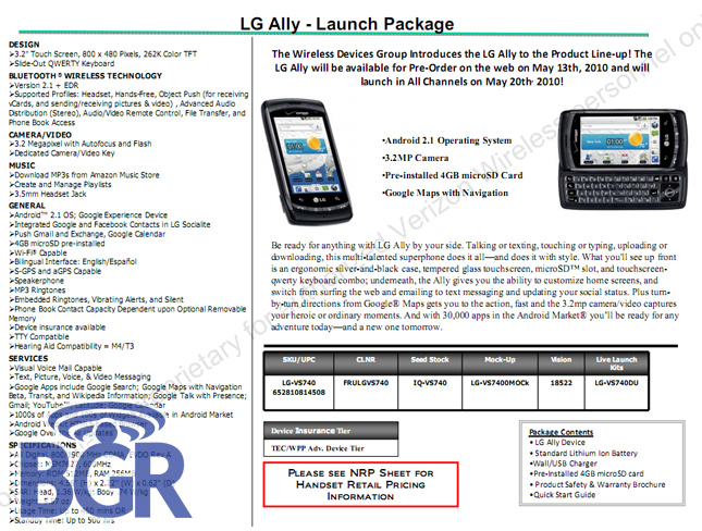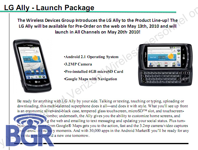 Details of the Verizon LG Ally have leaked, with BGR being sent internal documents from the carrier that tip the Android 2.1 smartphone for a May 20th release. The Ally has a 3.2-inch WVGA touchscreen, slide-out QWERTY keyboard, 600MHz Qualcomm MSM7627 processor and a 3.2-megapixel autofocus camera with flash; as well as Android 2.1 there's also a bevy of custom LG widgets that pull in calendar, weather and Facebook/Twitter details to the homescreen.