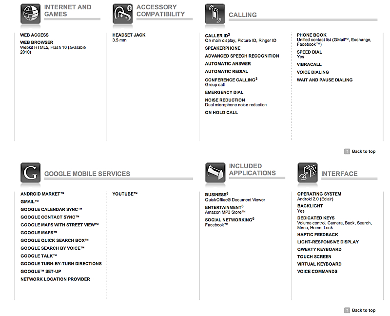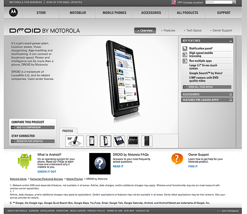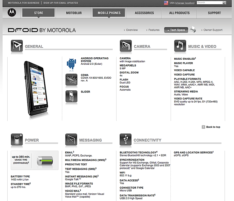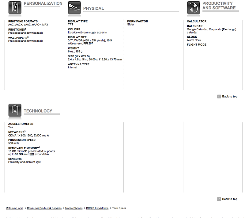Either someone at Motorola suffers from premature posting, or they're running a particularly arch teaser campaign; the product page for the Motorola Droid for Verizon has appeared and then been rapidly pulled, but not quickly enough to prevent its specs from going public. We now know for certain that the Verizon Droid has a 3.7-inch 16:9 aspect 480 x 854 touchscreen, 5-megapixel autofocus camera with 4x digital zoom and dual-LED flash, and a 1,400mAh battery which, Motorola claim, is good for up to a respectable 385 minutes of talktime and 270 hours standby.
