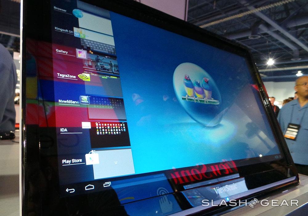 We got the opportunity to take a peek at the ViewSonic VSD240 24-inch Smart Display, what's essentially an oversized tablet on a stand working with an NVIDIA processor inside. This machine works with a full touch display attached to an NVIDIA Tegra 3 quad-core processor with 4-PLUS-1 technology. You'll be working with HDMI via MHL, full-sized USB, and Bluetooth connectivity as well.