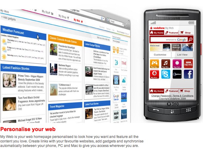 Vodafone 360 is a brand new set of internet services for the mobile and PC which gathers all of a customer's friends, communities, entertainment and personal favourites (like music, games, photos and video) in one place