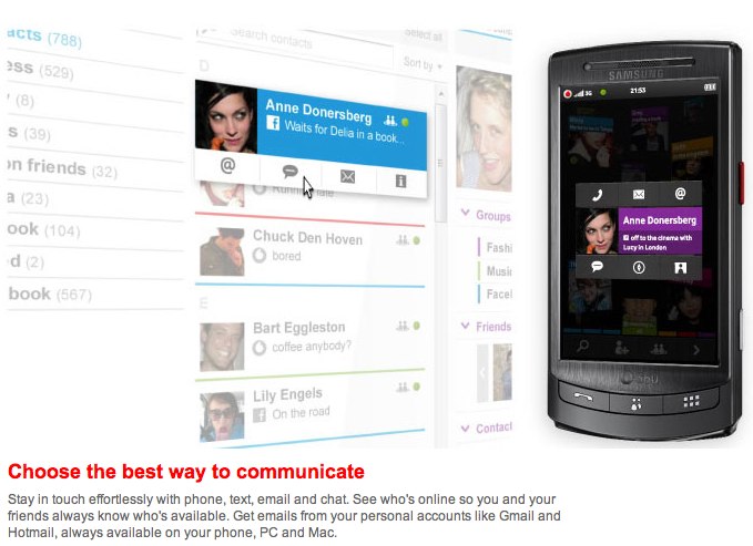 bringing together all contacts and content in one place and allowing customers immediate access to their various contacts across different networking sites – all the latest information updates including Facebook status updates and the ability to chat through Windows Live Messenger and Google Talk