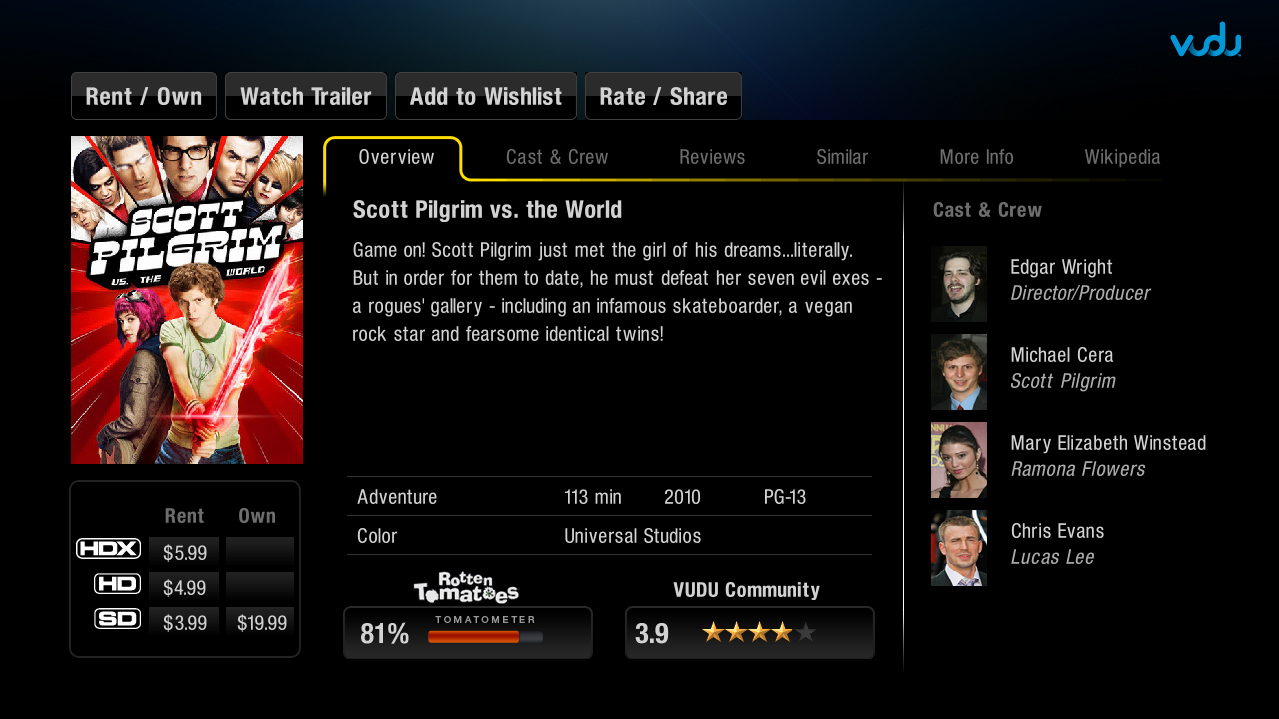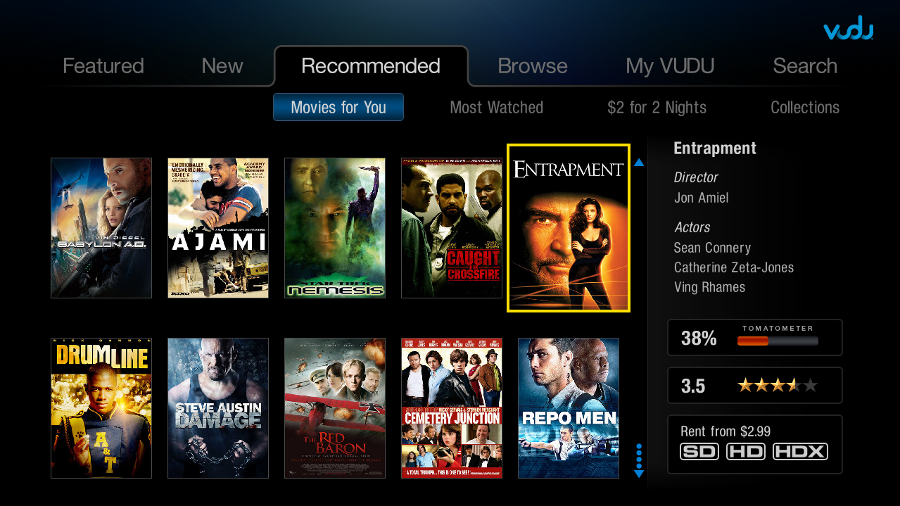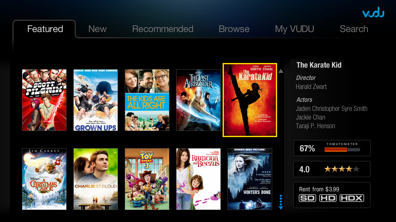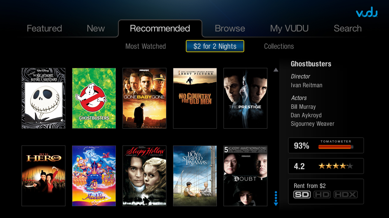 While retaining the rich cinematic feel of VUDU's original, highly acclaimed user interface, the new design provides an easy, intuitive structure organized around tabs, allowing users to navigate more quickly with fewer screen changes and fewer clicks. VUDU 2.0 also provides users with several powerful new tools, including personalized recommendations based on viewing history and ratings and enhanced browse and filter capabilities.