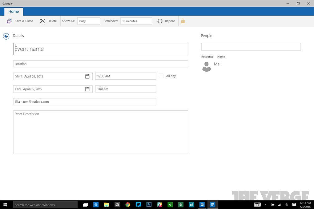 It's not clear how this preview version of Windows 10 was leaked or by who, but The Verge was one of the first to get their hands on it, currently identified as build 10051. At first glance, it's easy to see that Mail and Calendar are similar to what Microsoft displayed at its January Windows 10 event. They have been polished to match the look and feel of the new operating system, and are definitely a step up from the Windows 8.1 version of the apps. It's very likely these will appear in the next official preview in order to be widely tested.