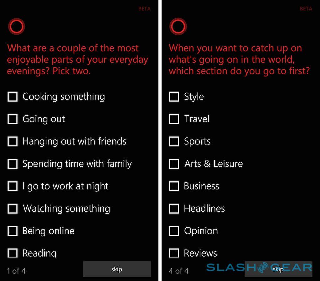 A long press on the search key summons Cortana, or optionally by tapping the Live Tile. When you first load the assistant, it runs through a few setup pages, starting with what your name is and how to pronounce it. After that, there are questions about personal preferences, like what you enjoy doing in the evening, and what categories of news you're most interested in. These shape the curated headlines shown in the Cortana app homescreen and on the Live Tile, though you can change your answers – or add more interests – later, if you're unhappy with the results.