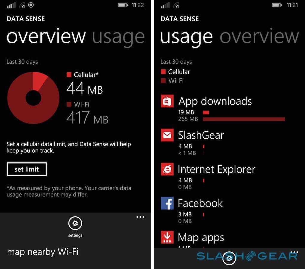 All that hopping between cellular and WiFi data could leave you unclear on how much of your monthly allowance is left, and so Microsoft added Data Sense back with Windows Phone 8. That shows the amount and proportions of cellular and WiFi data used over the past thirty days, as well as how much of each individual apps are responsible for confusing, allowing you to pinpoint which are particularly greedy. There's also an optional limiting system, which can be a one-off thing or applied every month.