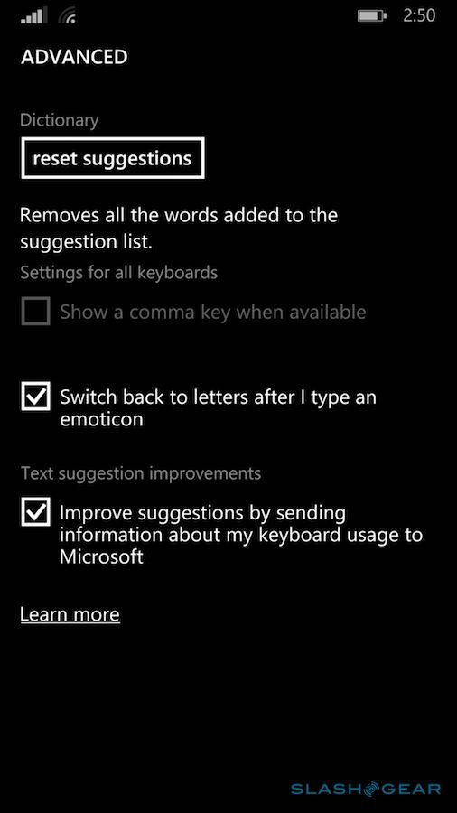 Word Flow is the handiwork of the same team that developed the original Windows Phone on-screen keyboard, not technology simply bought in for the OS. While it may look straightforward, the Windows Phone keyboard is actually surprisingly clever under the hood. For instance, it continuously analyzes whether users tend to hit the middle or one of the edges of the keys, and adjusts the invisible trigger area accordingly so as to boost accuracy.
