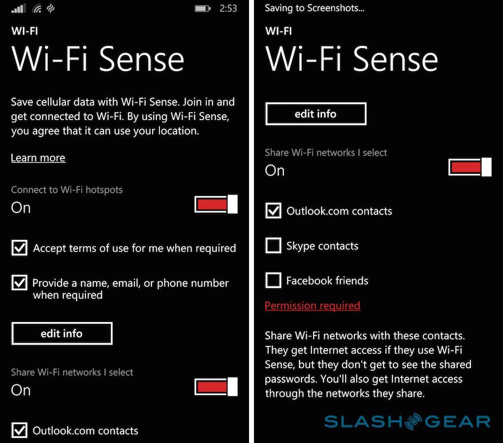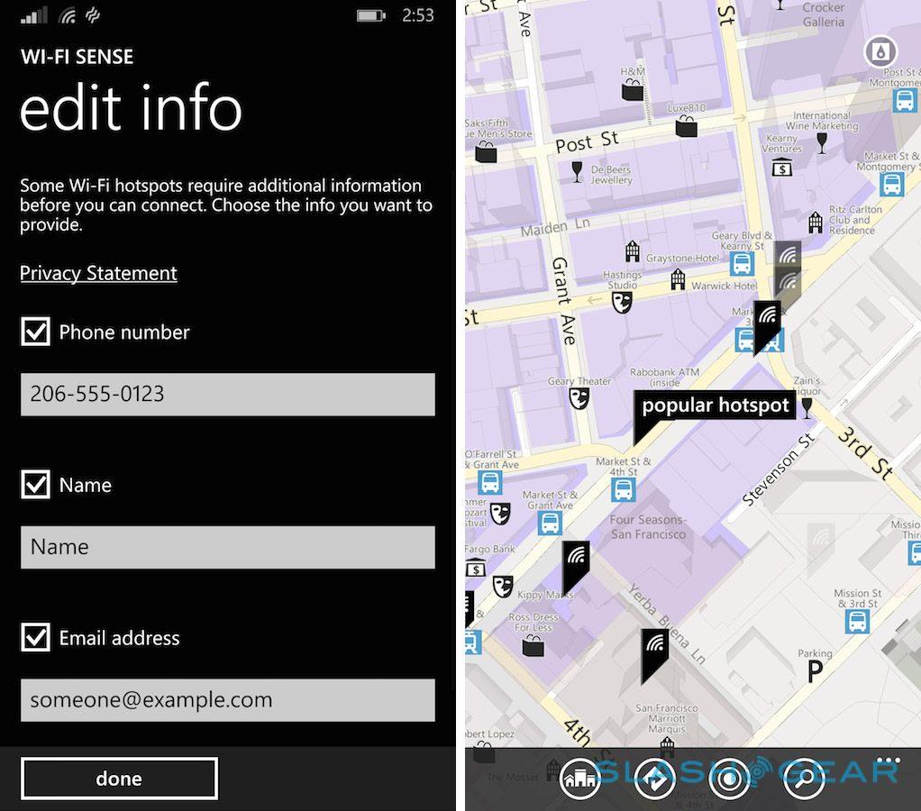 For the former, Windows Phone 8.1 can optionally try to log in to public hotspots it comes across, with no manual prompting from the user. Since such hotspots often require a login first – and some sort of box ticked or button clicked to agree to terms and conditions – WiFi Sense can use your preset credentials (name, number, and email address) to automatically register or sign in.