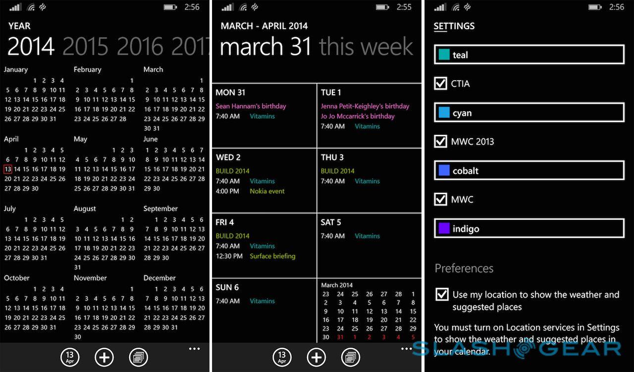 Happily, those worries proved unfounded. Microsoft is making heavy use of color coding, using a range of bright, user-customizable hues to indicate different calendars in a packed schedule. It's clear and crisp on the simple black background with white dates and times, with Windows Phone 8.1 automatically pulling in all our Google Calendar entries and separate schedules after we logged in. However, it'll also do the same with Outlook, Yahoo, Exchange, and Facebook calendars, with the option to hide them too.