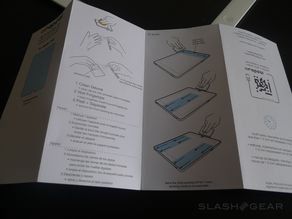 They do give you a wet napkin sort of deal, and a cleaning cloth so that you can reduce your chances of getting dust between your screen and the wrap, and so you can get your dirty, dirty hands clean.