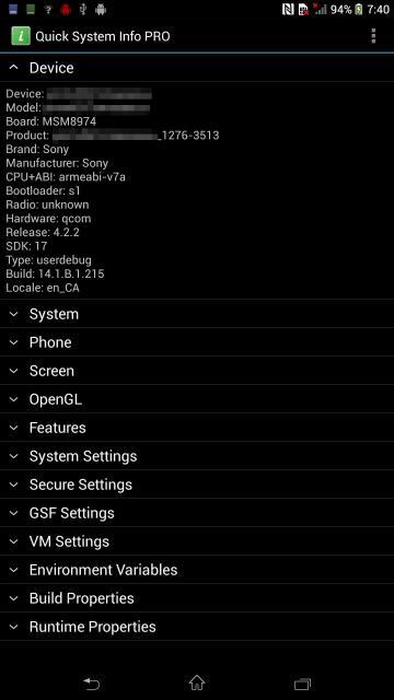 The Sony Xperia Z Ultra has been suggested by this screenshot-snapper's images as working with 2GB of RAM as well as 16GB internal storage. This machine works with Android 4.2.2 Jelly Bean and will be working with a Qualcomm MSM8974 quad-core processor. That is to say it's the Qualcomm Snapdragon 800 quad-core SoC with Adreno 330 graphics.