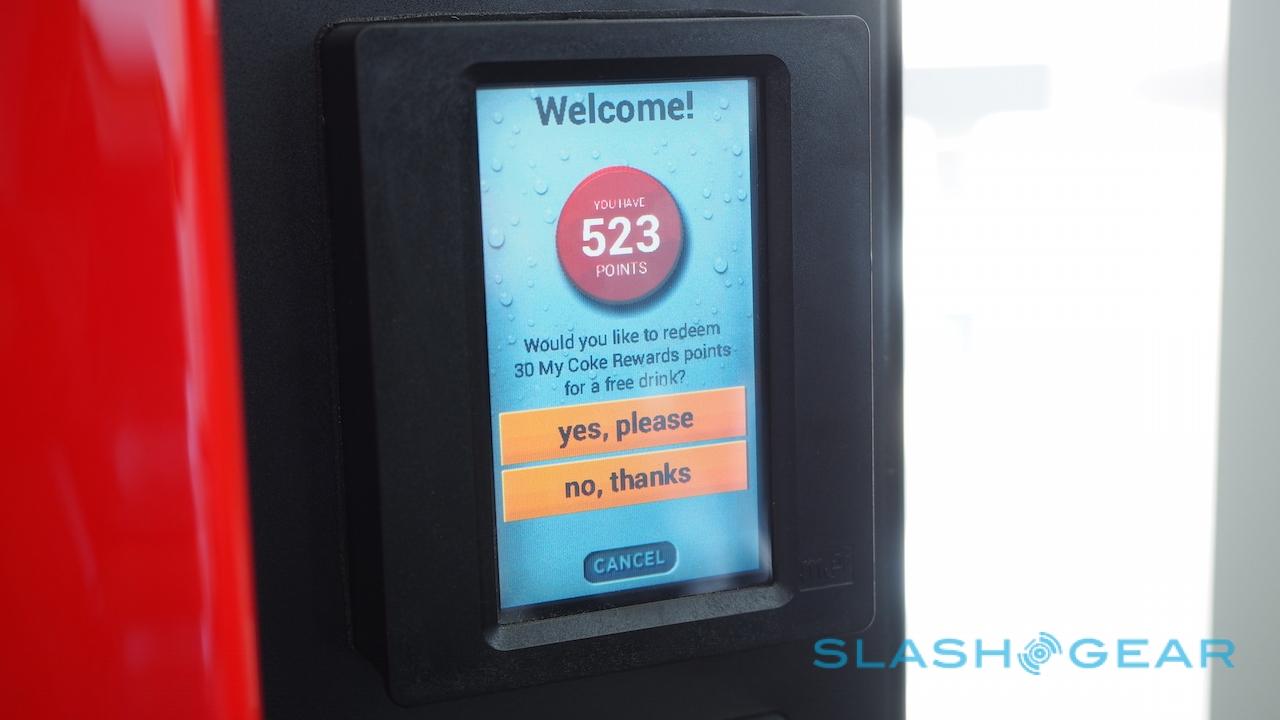 In this particular case, two things were being recognized simultaneously: not only the default credit card, here American Express, but also a Coca-Cola loyalty card. That was pulled up automatically because the vending machine identity was recorded, and the current points tally appeared on-screen so that you could pick between redeeming that or paying as normal.
