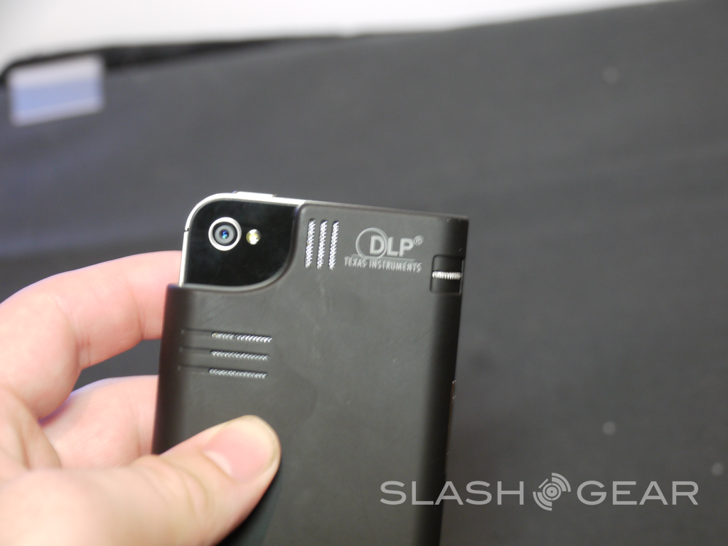 Announced late last year many still haven't seen or heard of such a device so we figured a few quick photos would give you a good idea of what to expect. This pocket projector is basically an iPhone 4/4S battery-equipped case featuring TI's DLP Pico projector technology. It will extend the battery life almost double offering a 2,100 mAh battery, and also doubles as a case — just a bit fat and not very ergonomic.
